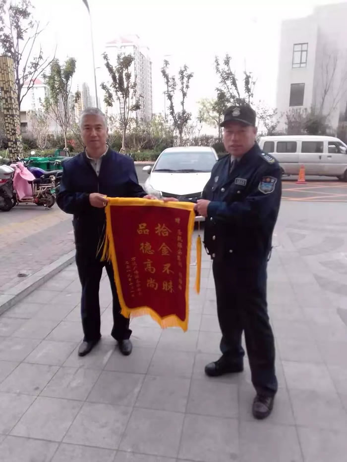 10月1日,武漢保安駐人信匯購物中心項目安保員楊棕柏撿到一部新手機,經(jīng)多方努力,終于聯(lián)系上失主歸還手機。為表示感謝,失主將一面寫有“拾金不昧 品德高尚”的錦旗贈送給楊棕柏。 業(yè)主激動地說:“有武漢保員,我就是放心。”